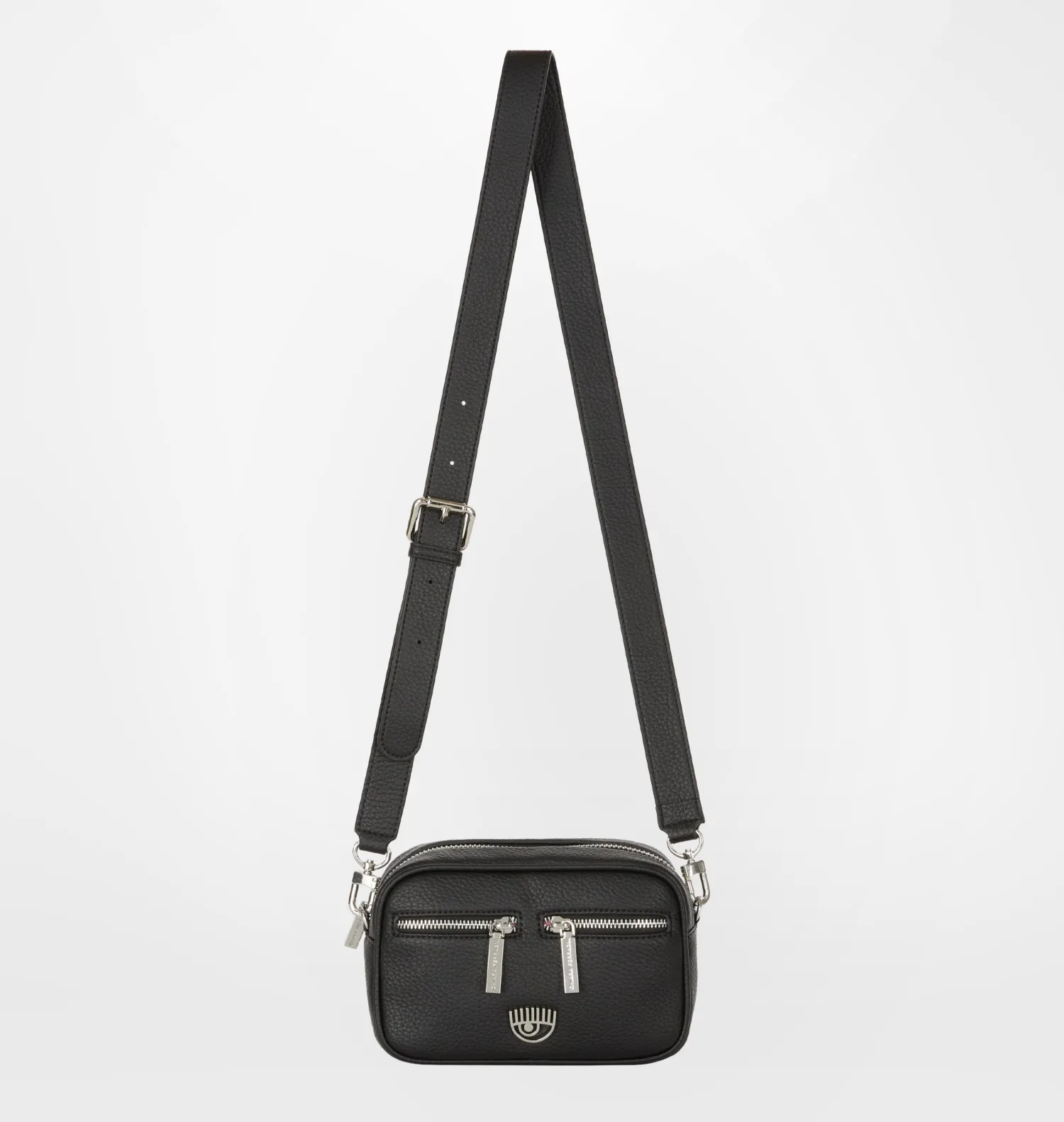Garnet-effect black bag with Eye Star metal feet on the bottom. Equipped with removable shoulder strap.