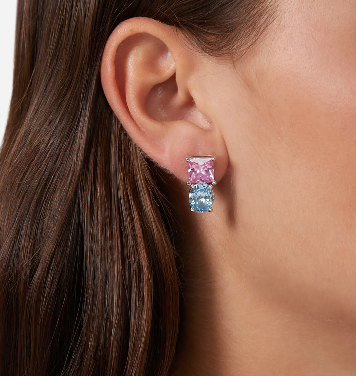 Rhodium-plated cubic zirconia earrings with a square-cut pink stone and an oval-cut blue stone.