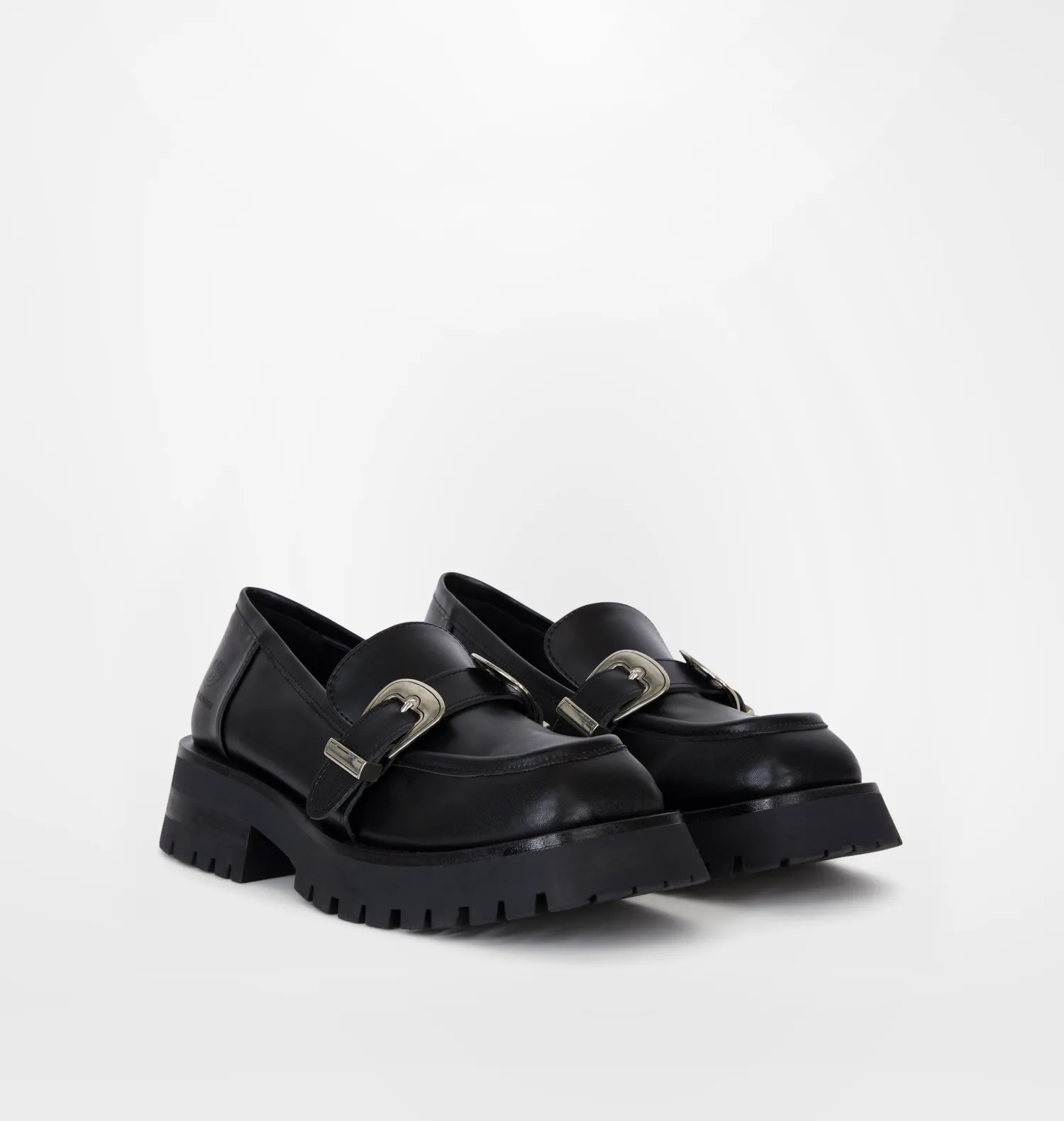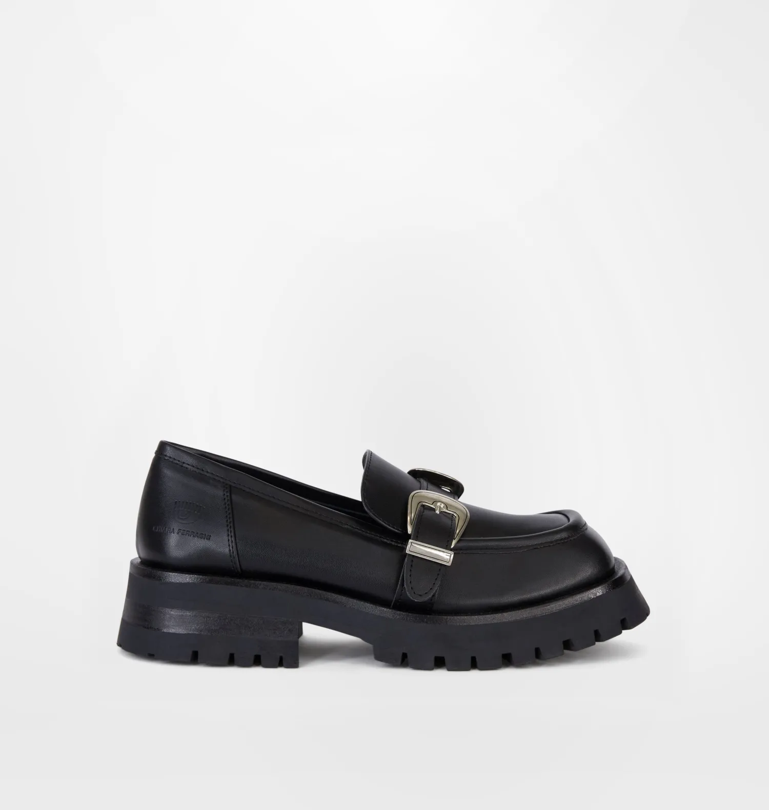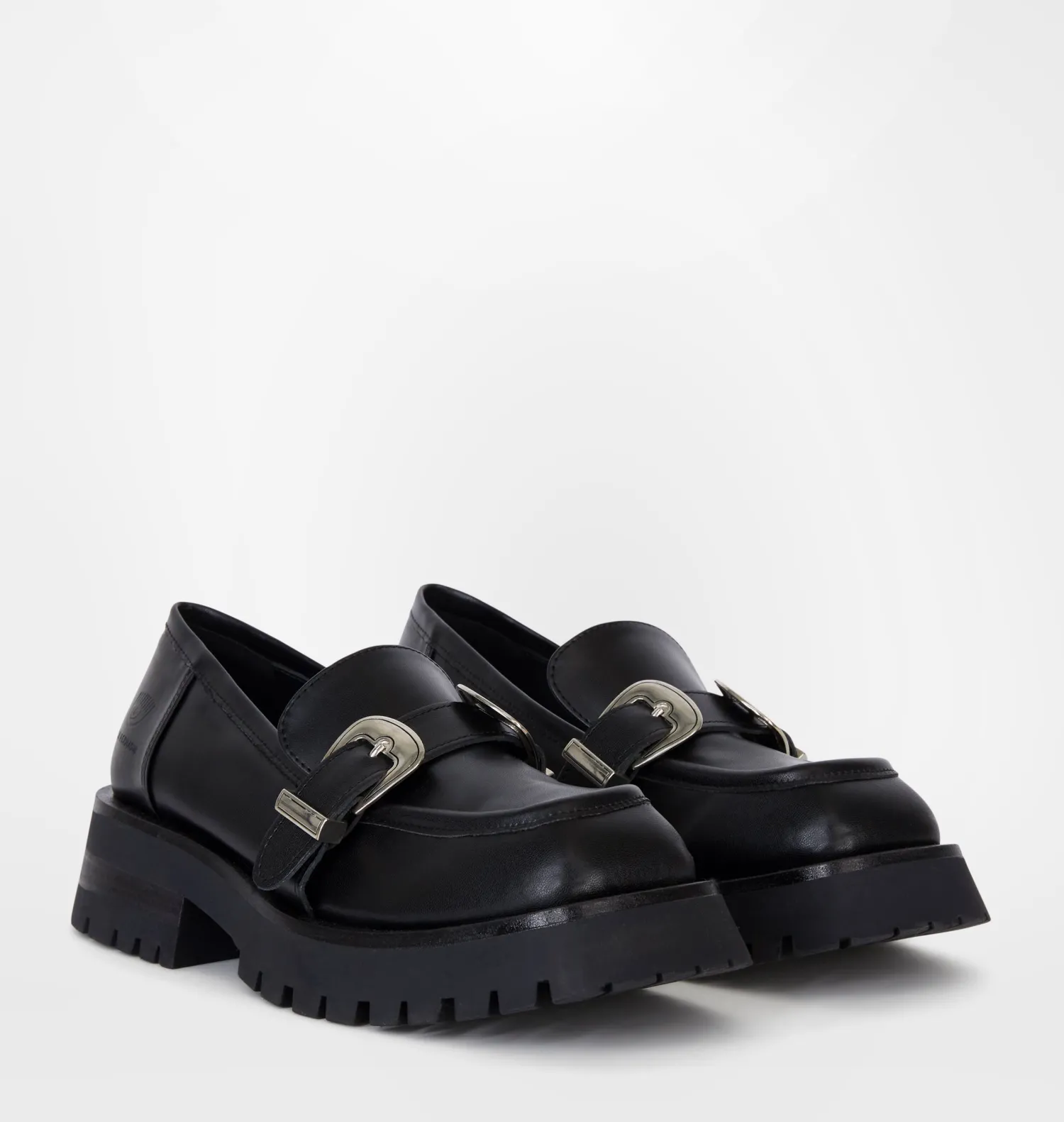 Black leather loafer with buckles. Rubber sole and squared toe.