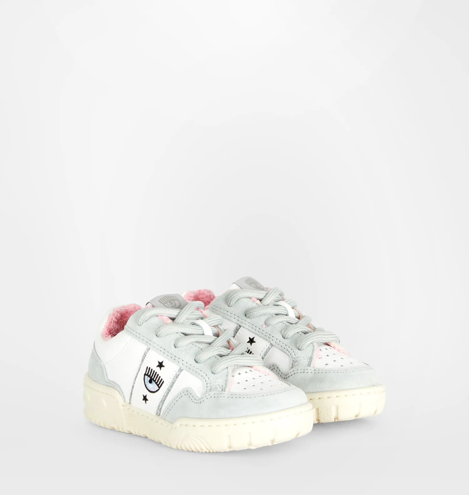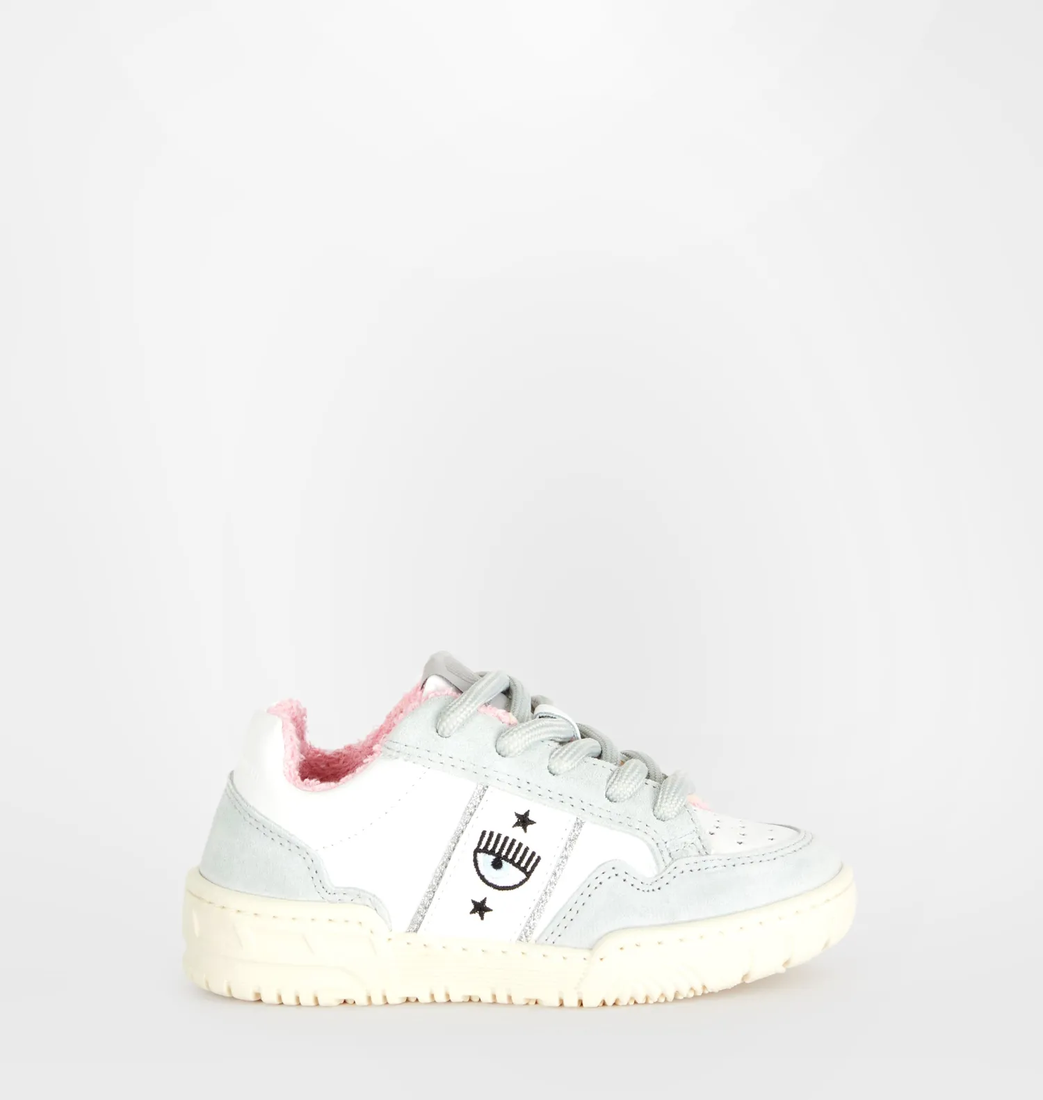 CF-1 sneakers in pelle bianca con dettagli grigio/azzurro. Banda Logomania sui lati. Fodera in spugna. Suola in gomma.