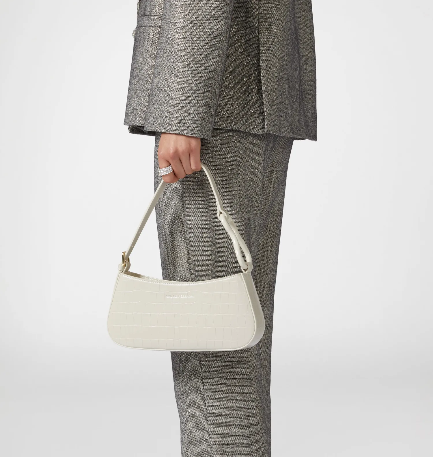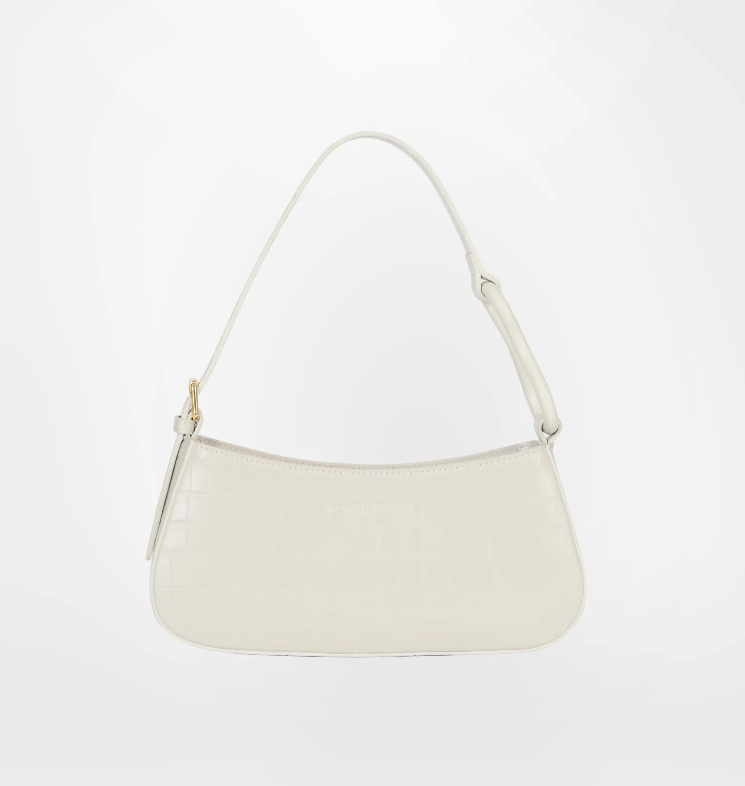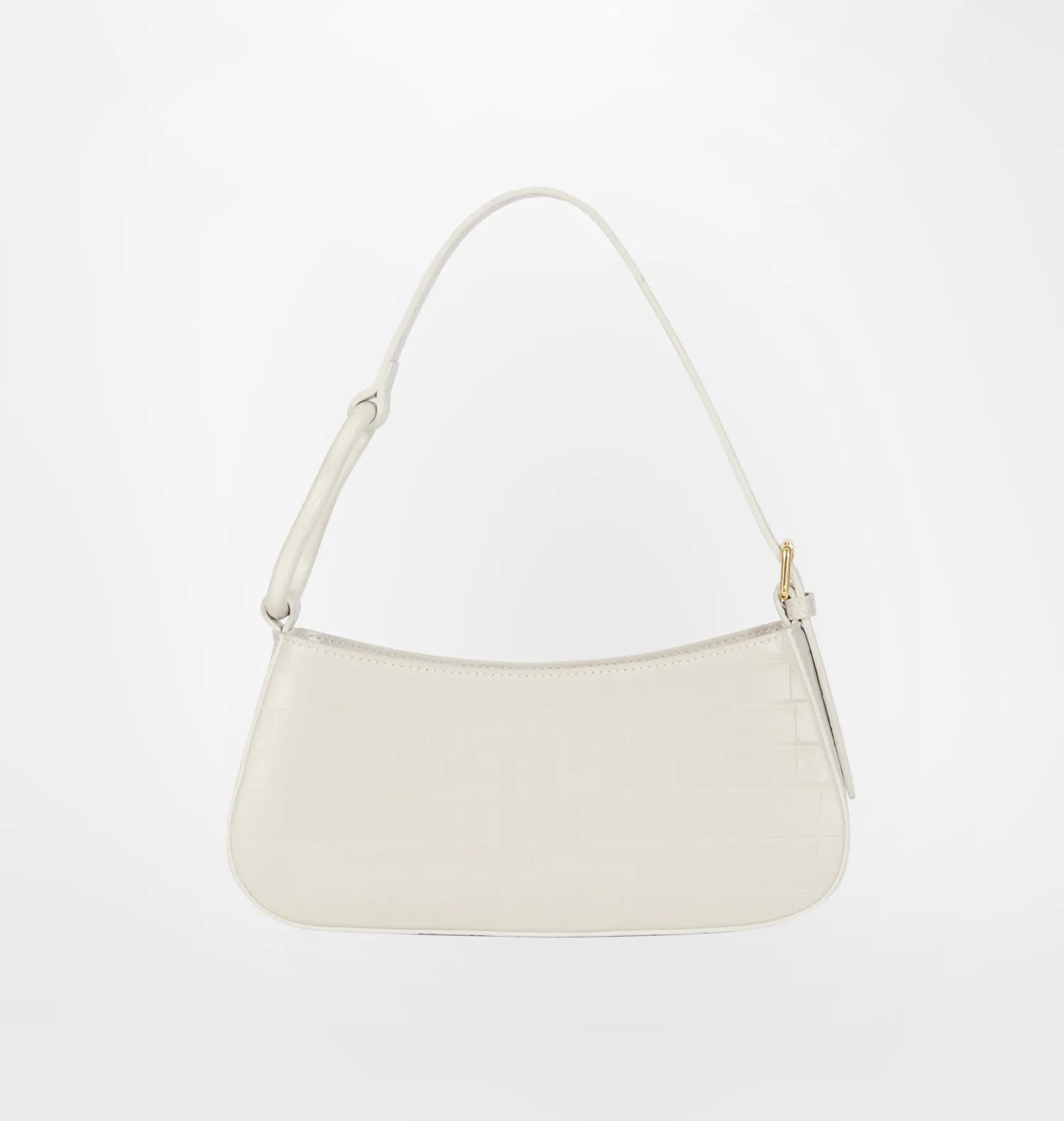 Cream shoulder bag in shiny brushed synthetic material with crocodile effect, with metal loop on the handle. Zip closure…