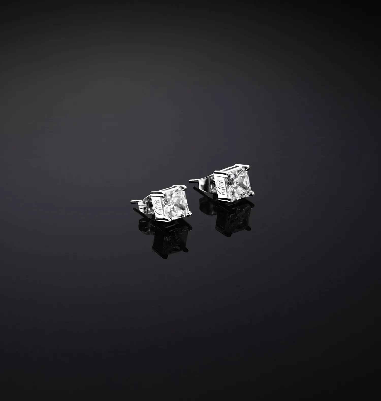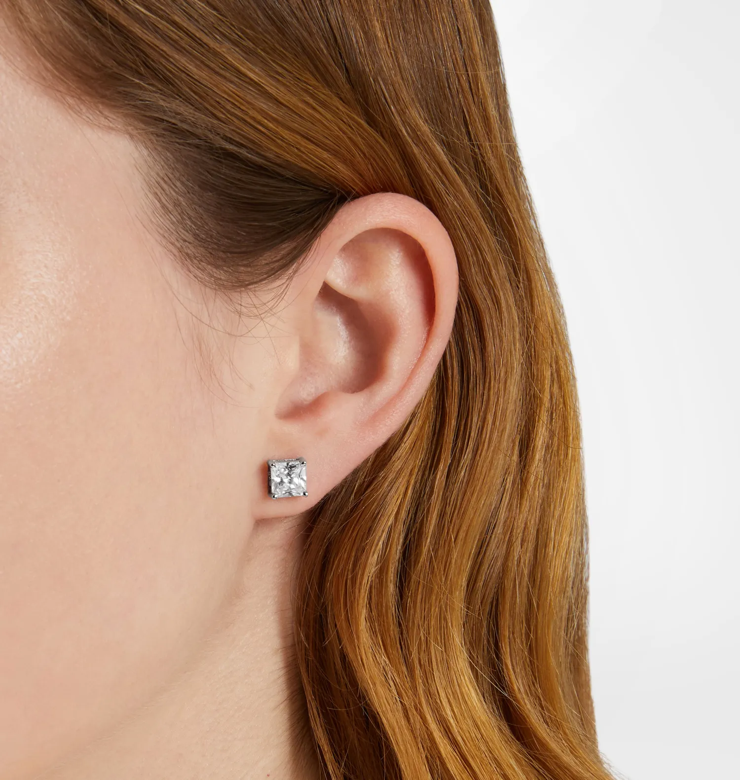Lobe earrings with square white cubic zirconia on silver-plated setting.