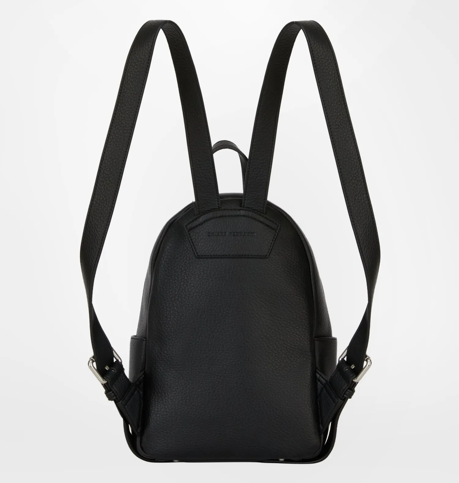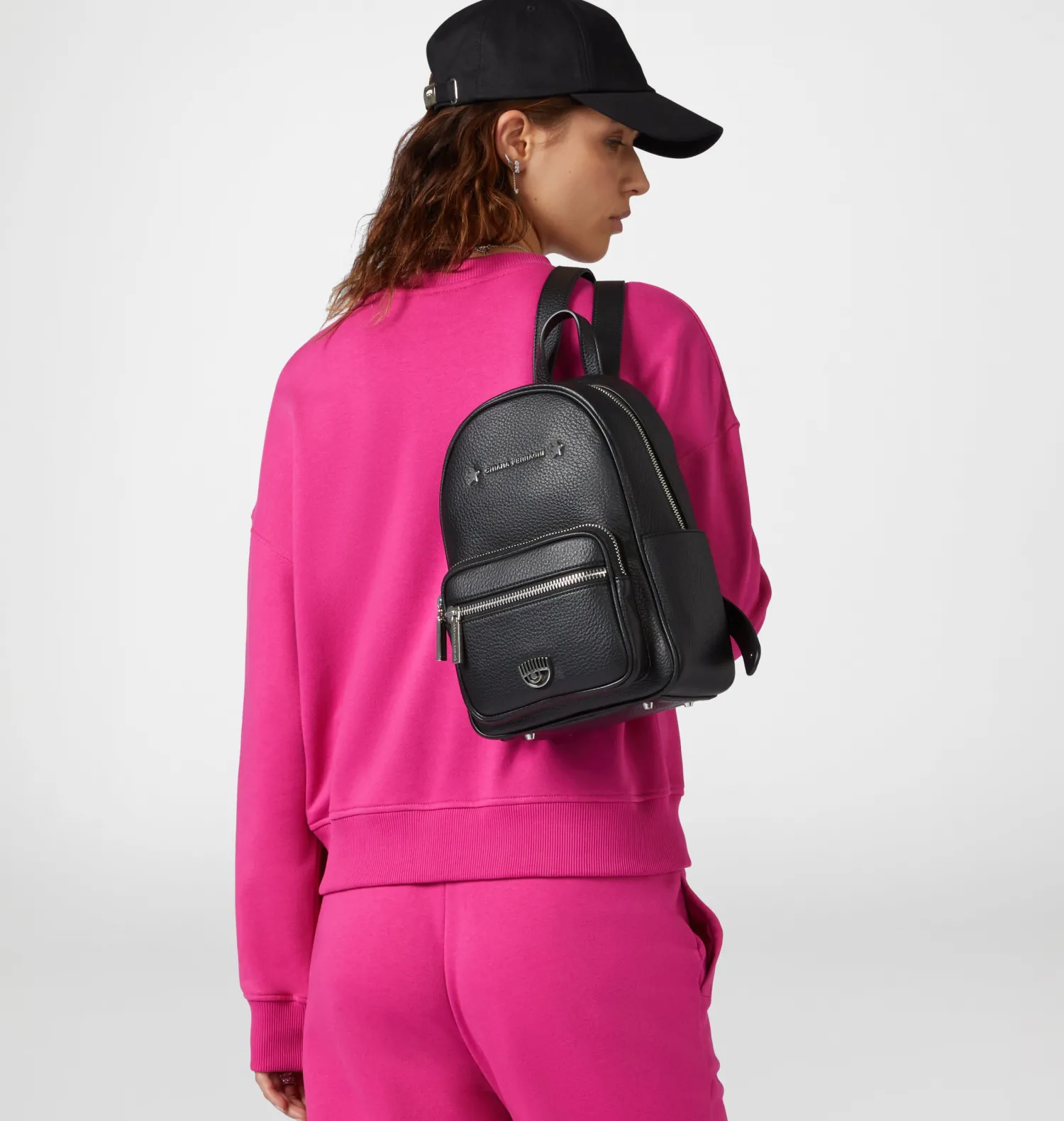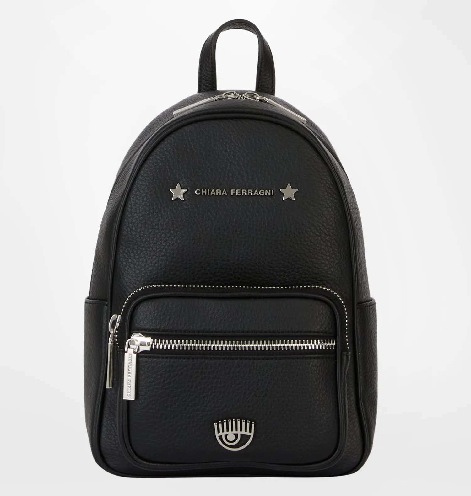 Backpack in black garnet-effect synthetic fabric with metallic Eye logo on the front pocket. Adjustable shoulder straps.