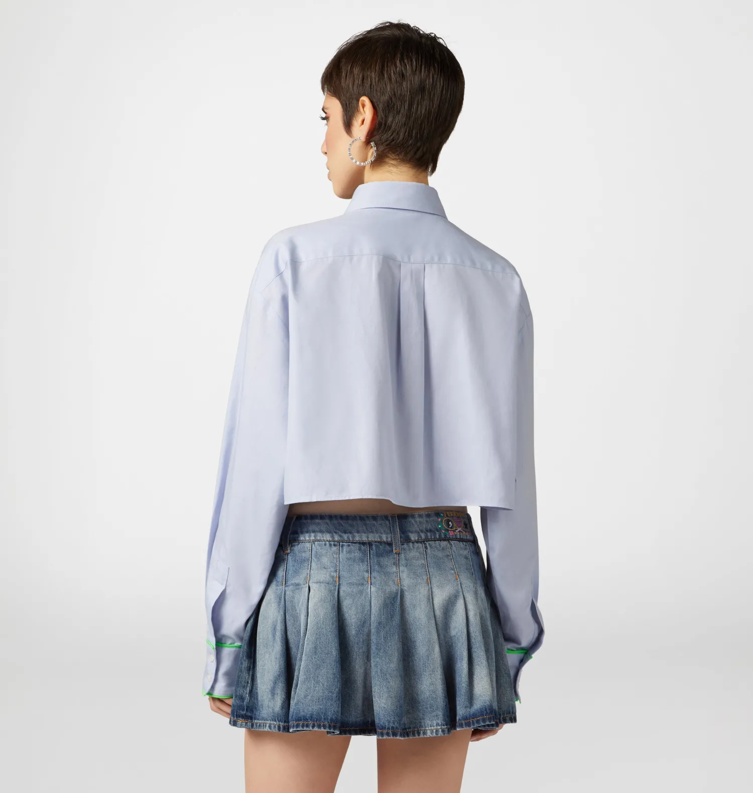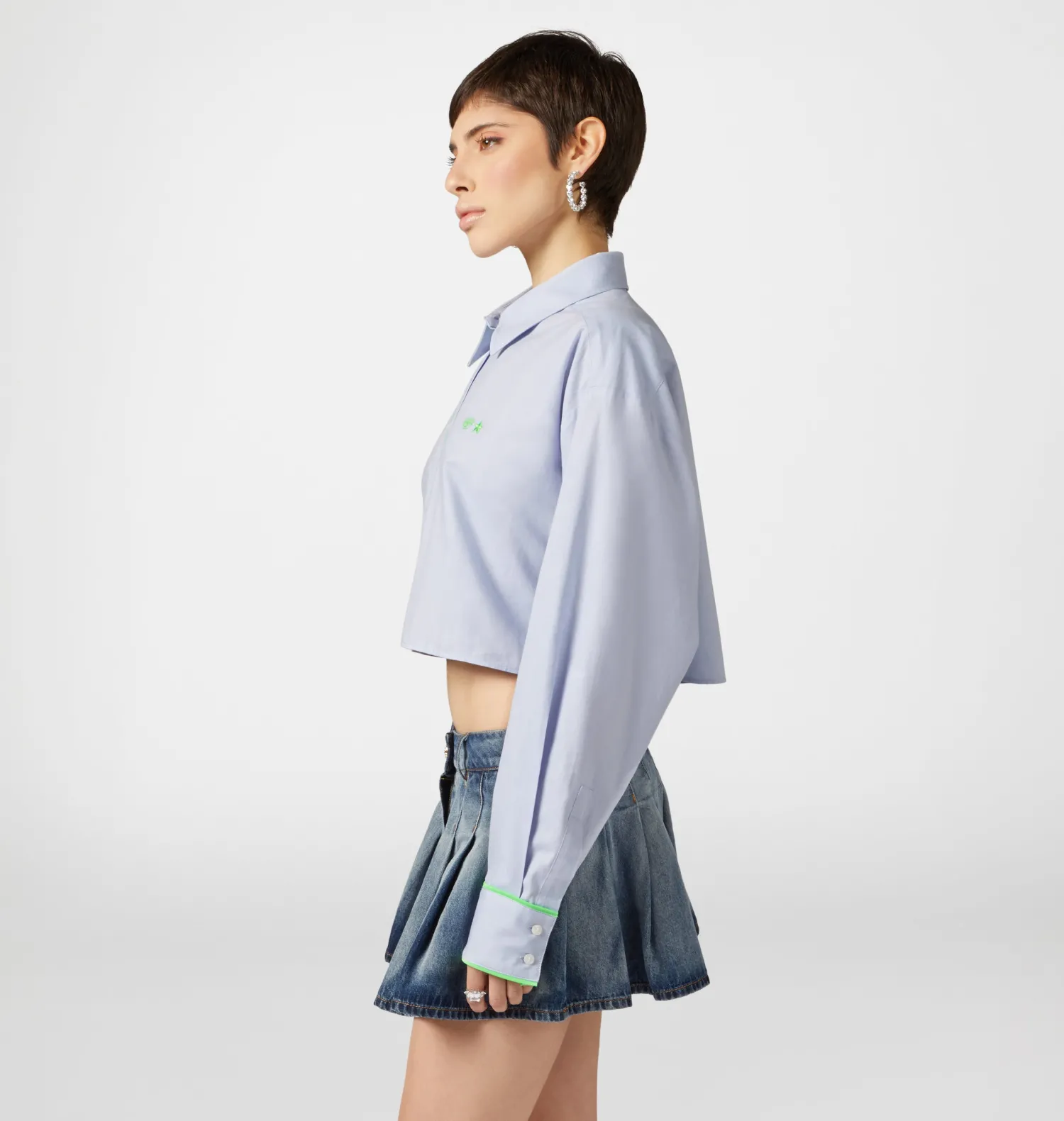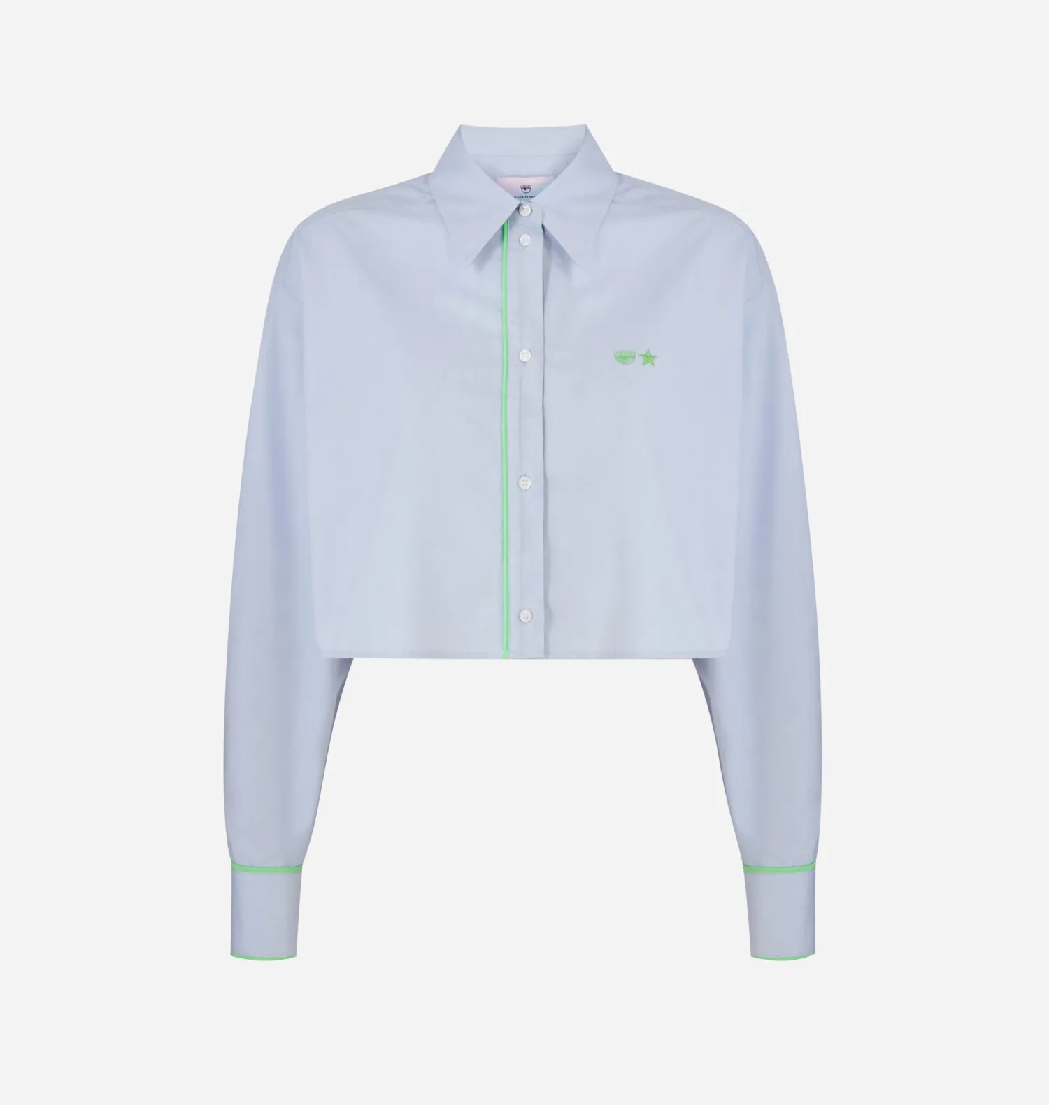 Long-sleeved cropped shirt in light blue cotton with neon details and Eye Star embroidery