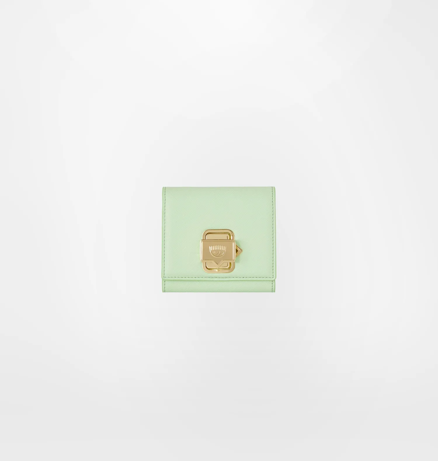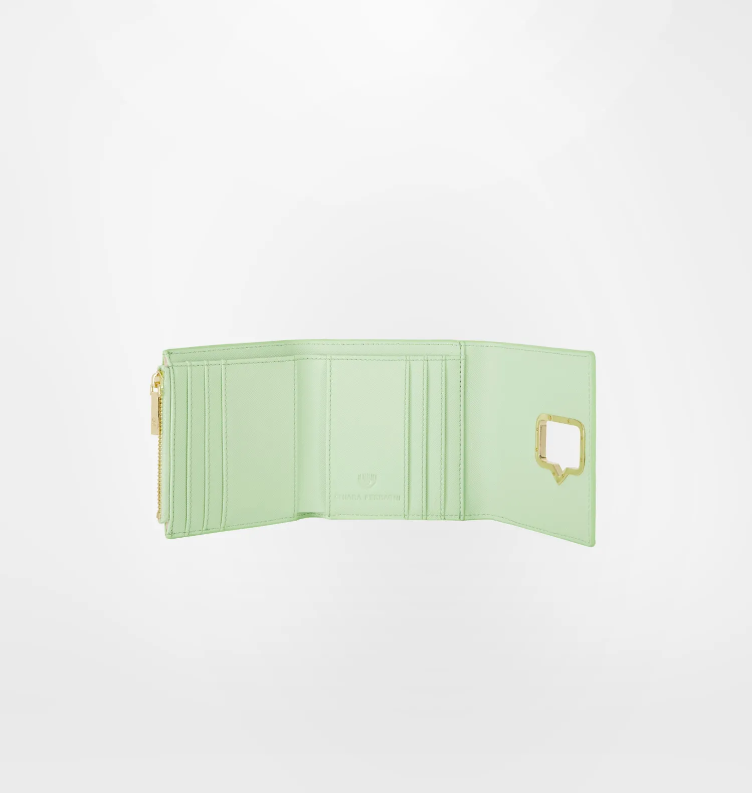 Green wallet with zip and Eyelike Lock.L: 11 cm, H: 10,5 cm, P: 3 cmFabric 1: 100% PolyesterLining 1: 100% Polyester