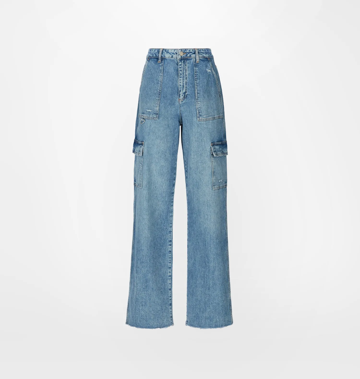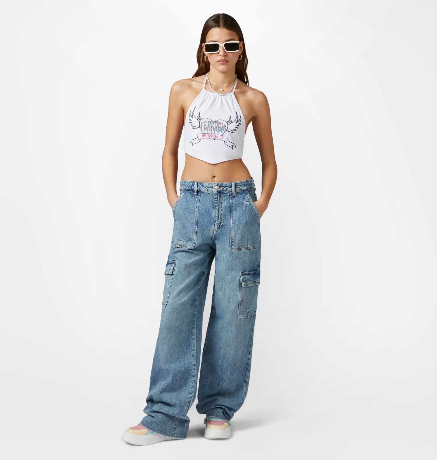 Denim cargo trousers with raw cut and rips, Ferragni Punk print on the back pocket.