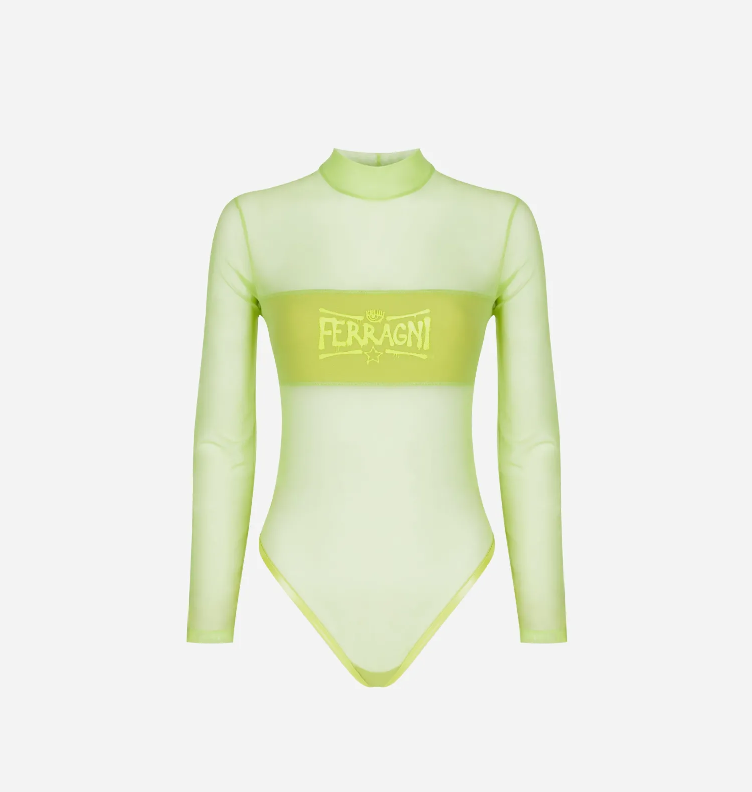 Yellow stretch tulle bodysuit with long sleeves and high collar, bandeau bust cover-up and Ferragni graffiti print.