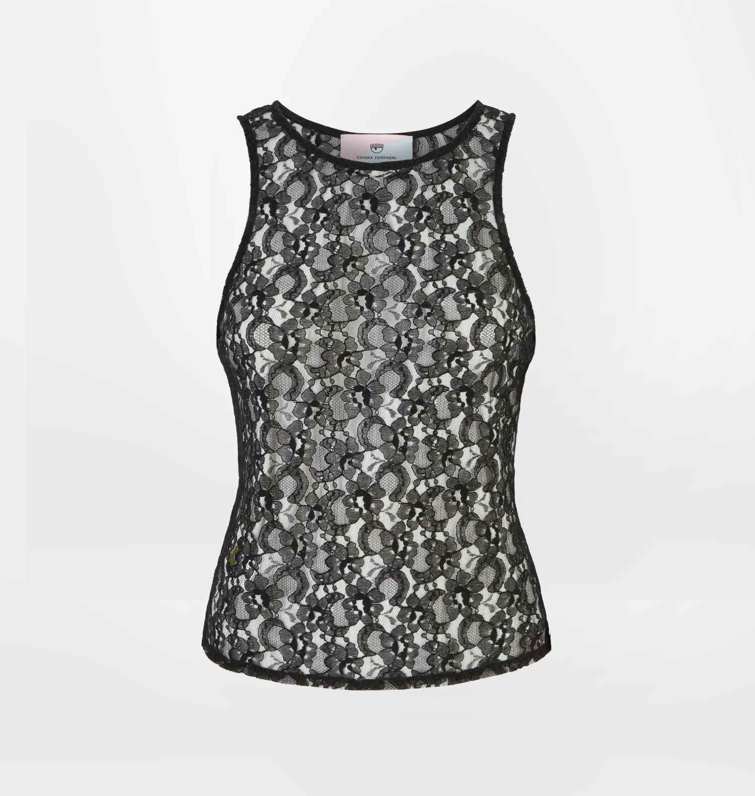 Transparent black lace tank top, slim fit with zip opening on the side.Fabric 1: 100% Polyamide