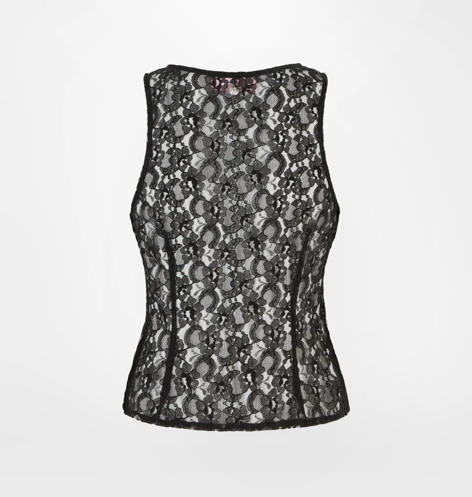Transparent black lace tank top, slim fit with zip opening on the side.