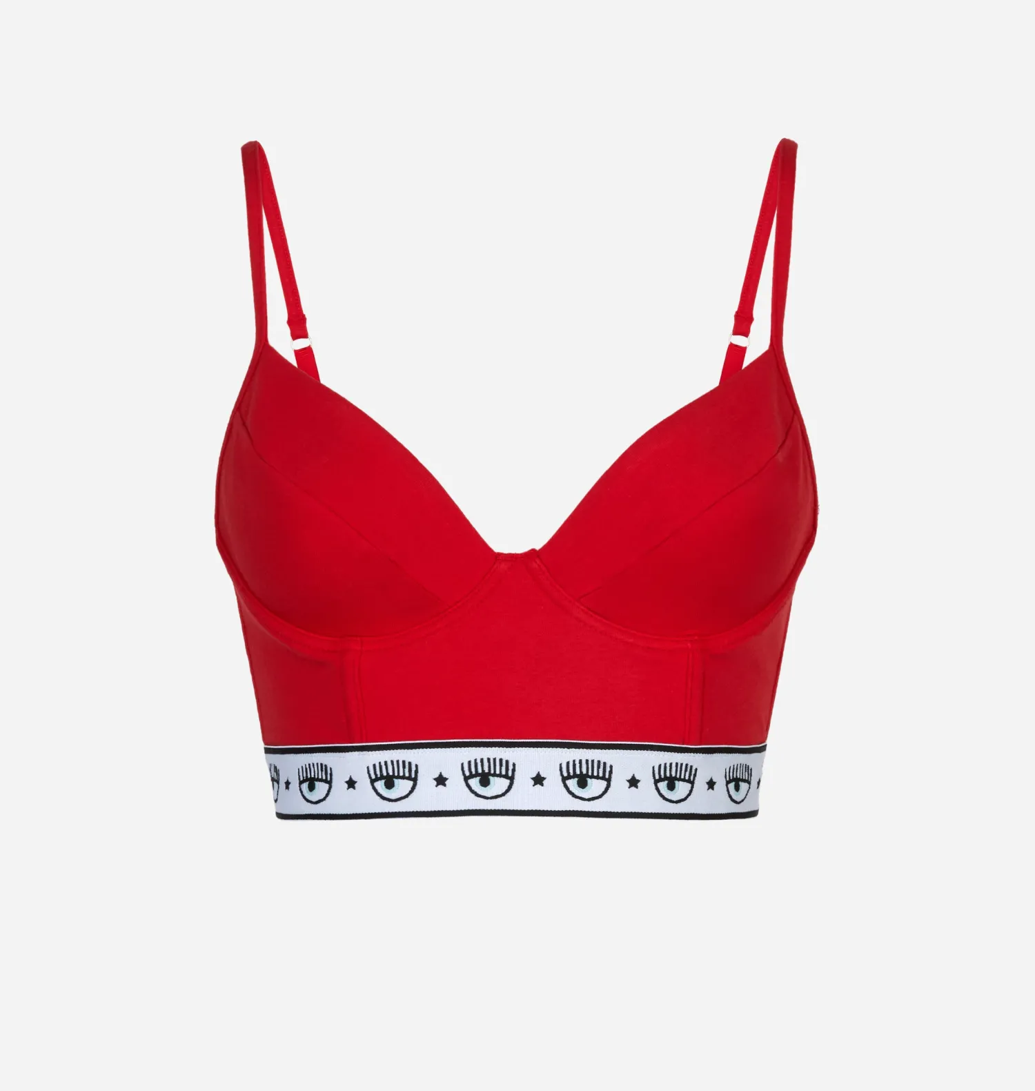 Red cotton bralette with corset-effect cups and Maxi Logomania elastic band.95% Cotton; 5% Elastane