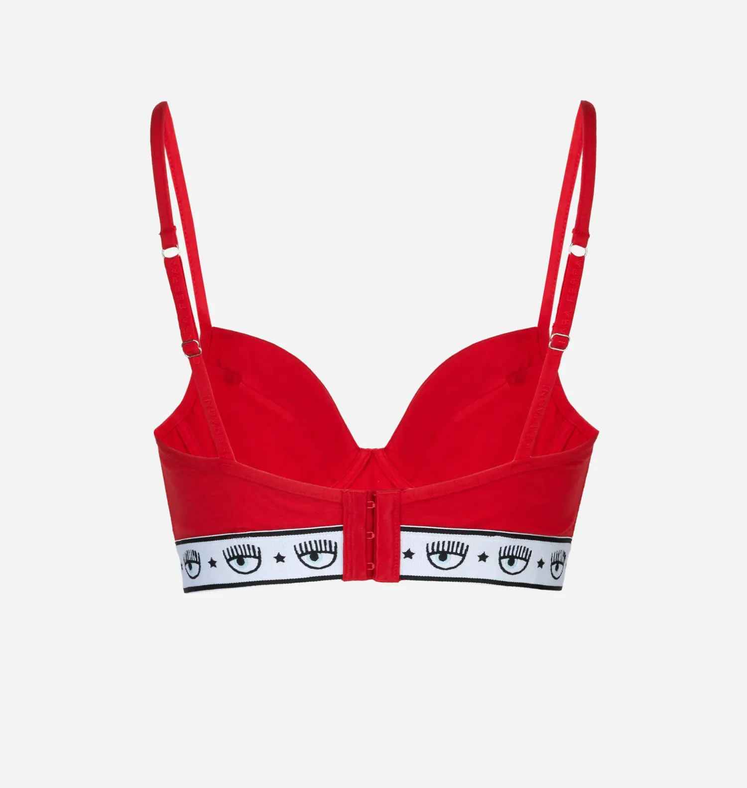 Red cotton bralette with corset-effect cups and Maxi Logomania elastic band.