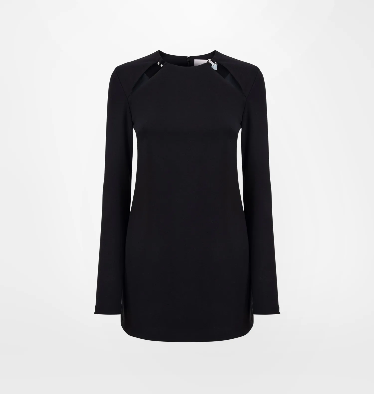 Black viscose short dress with long sleeves and piercing motif on the front neckline.