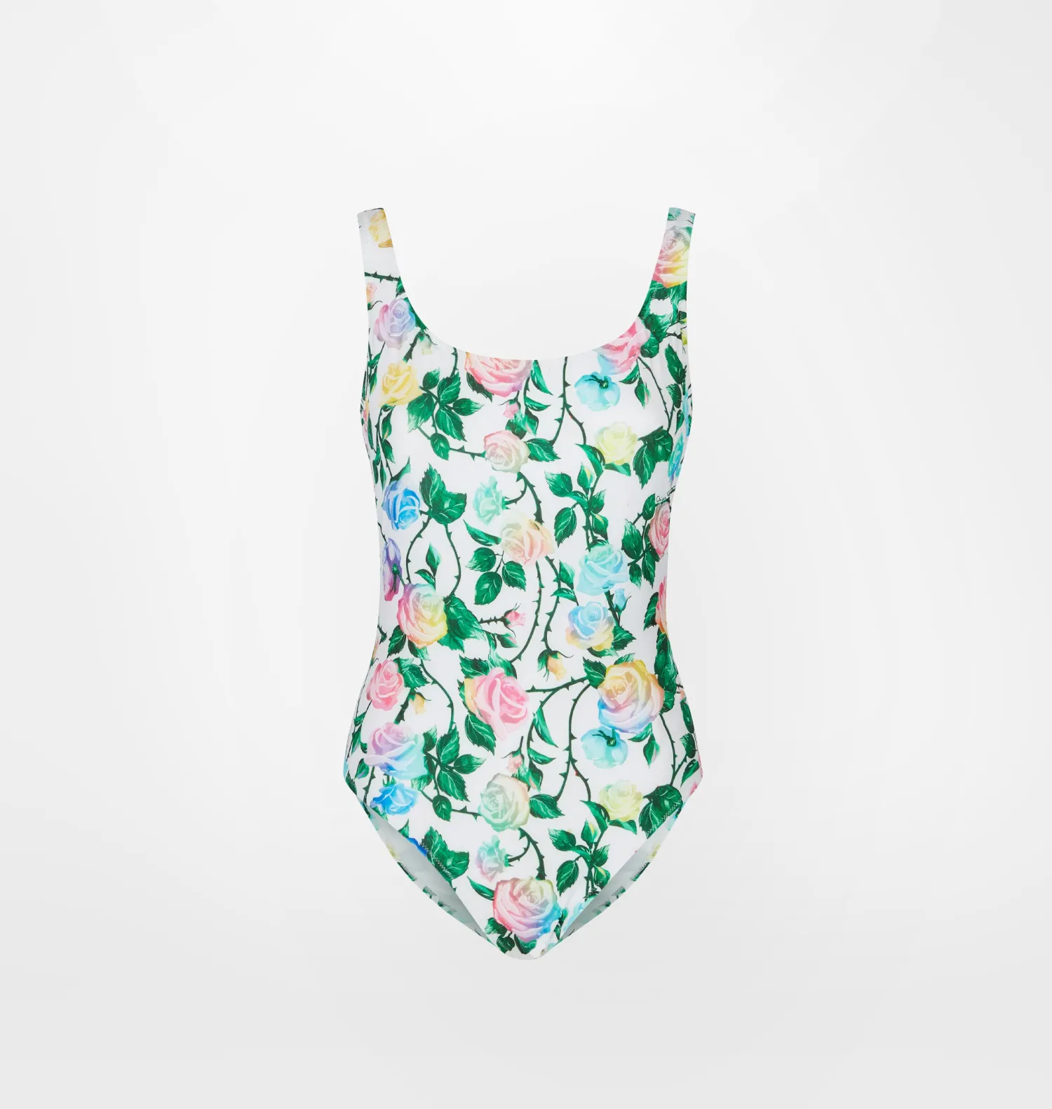 White one-piece swimsuit in Roses print.85% Polyester; 15% Elastane
