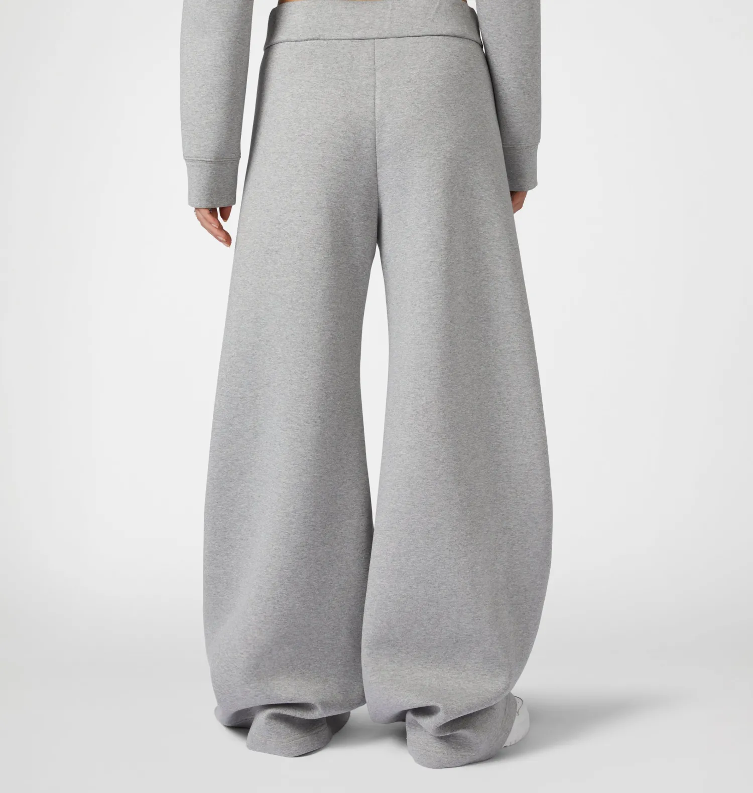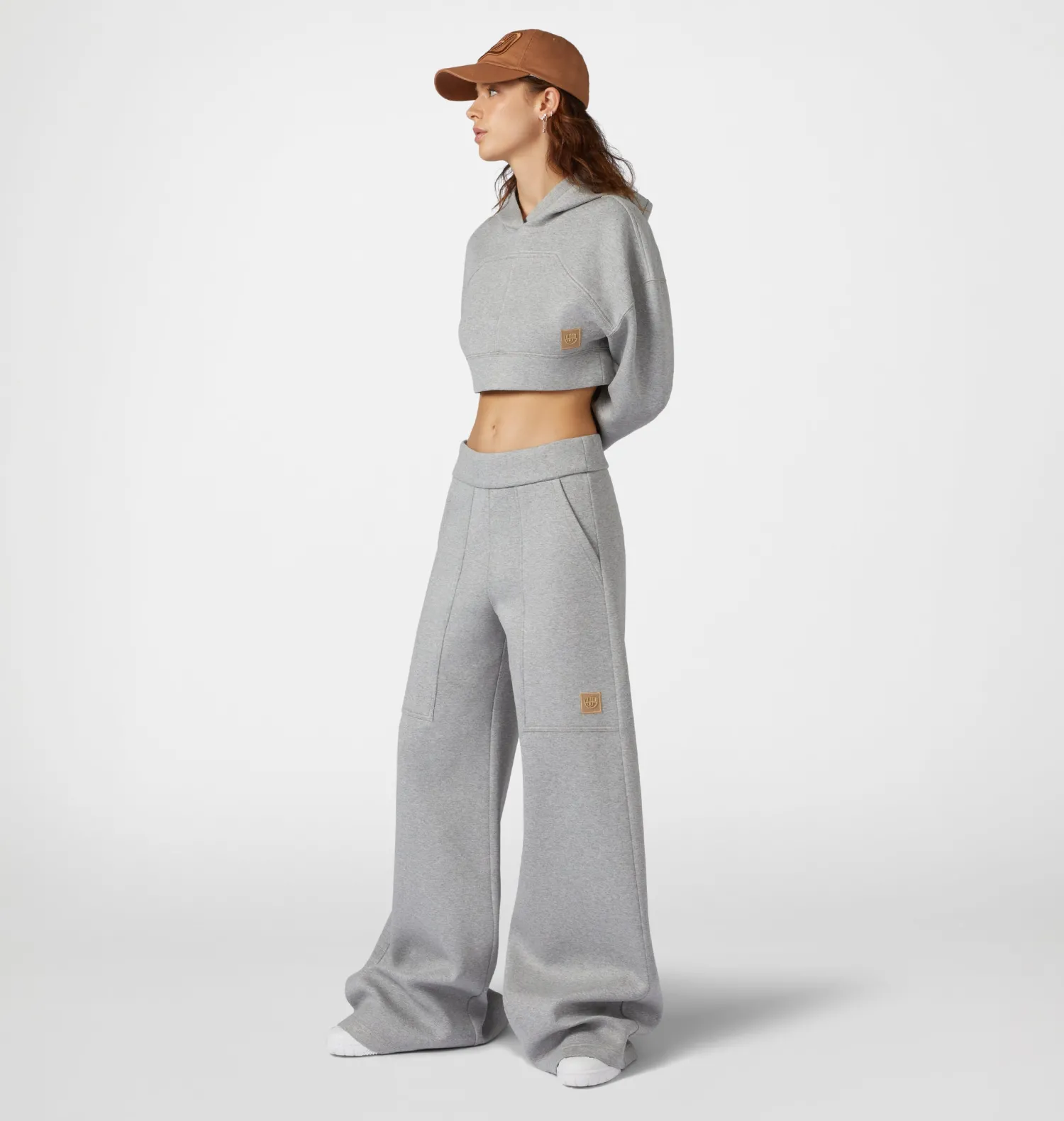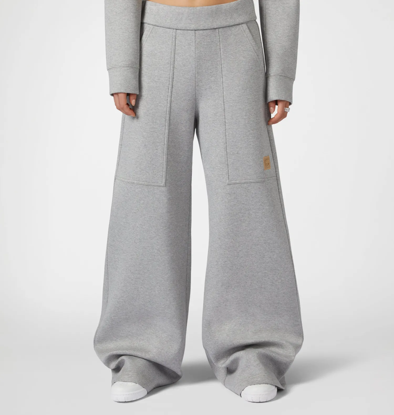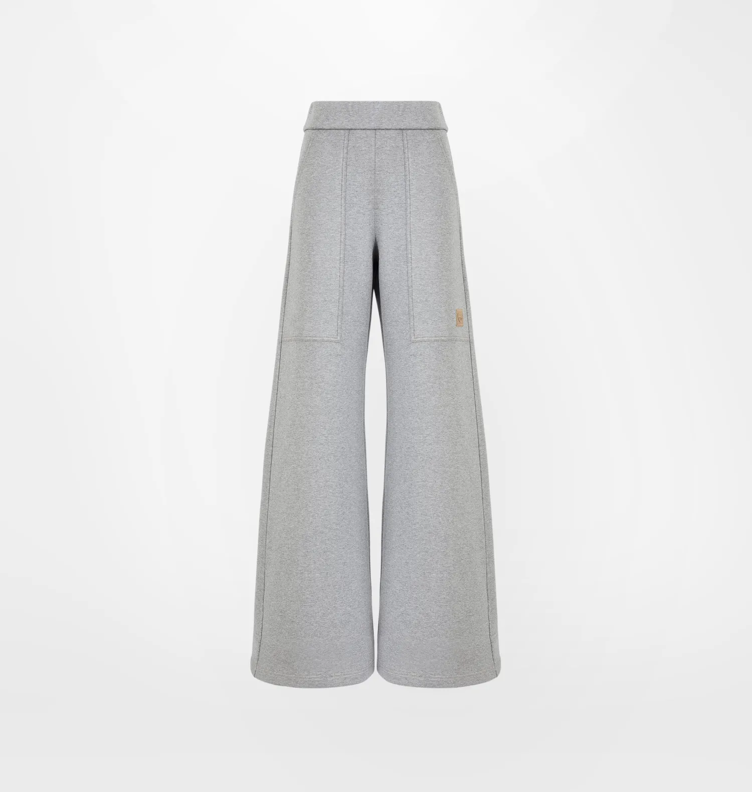 Grey viscose scuba trousers with logo patch. Low waist and wide leg.