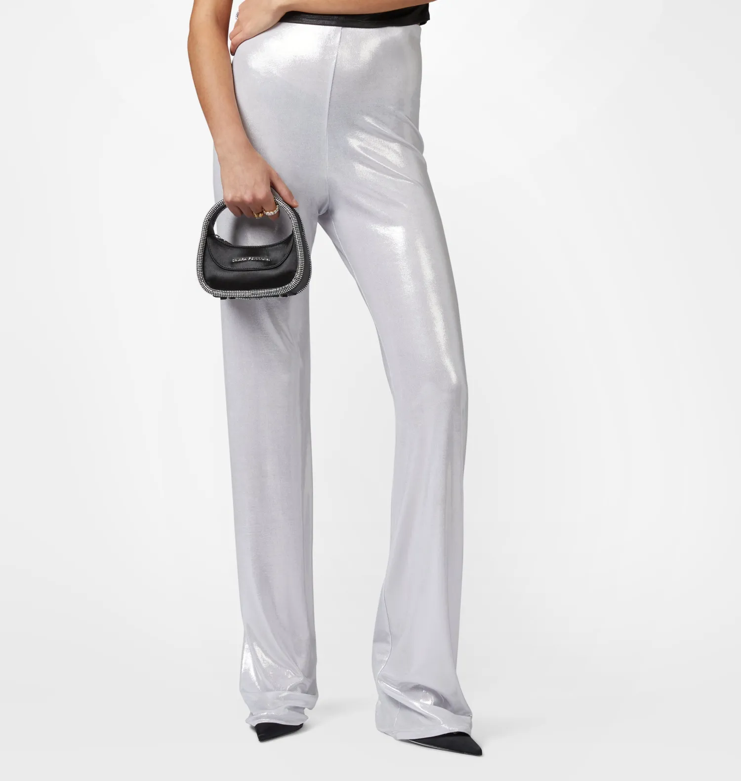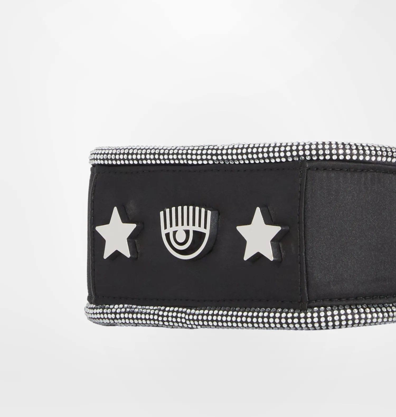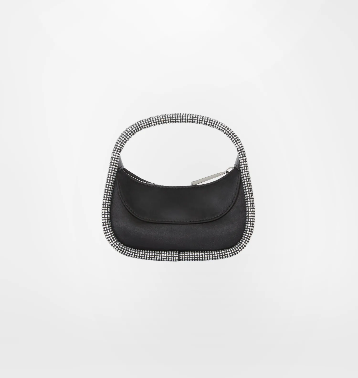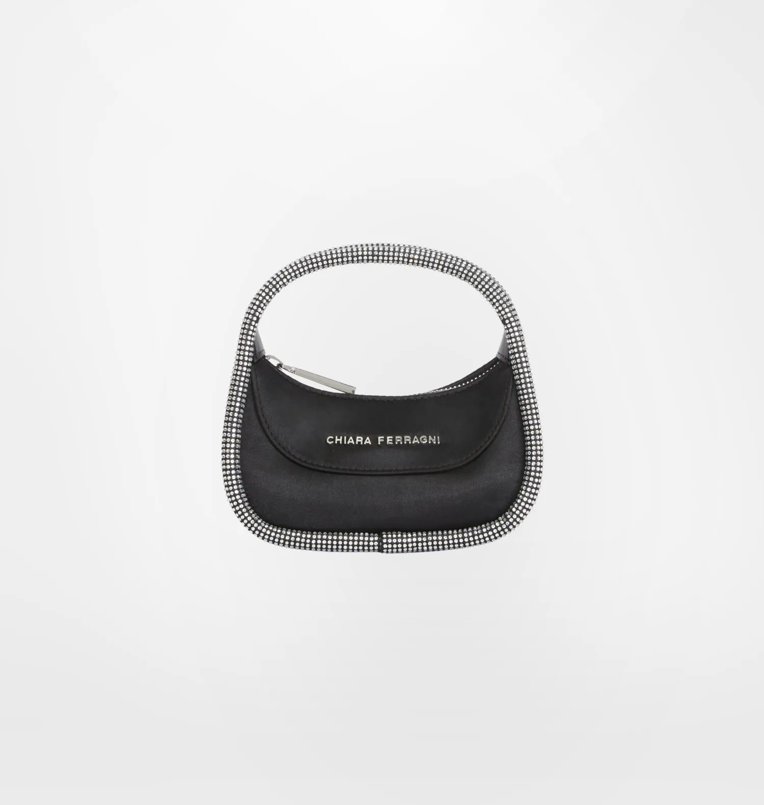 Hyper bag in black satin with maxi rhinestone piping and zip fastening. Eye Star metal feet on the bottom.